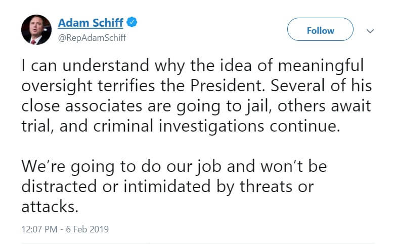 «Я могу понять, почему идея реального надзора ужасает президента. Несколько его близких партнеров уже приговорены к заключению, остальные ждут суда, уголовные расследования продолжаются. Мы будем делать свою работу, и не будем принимать во внимание или пугаться угроз и нападок», — заявил Шифф.