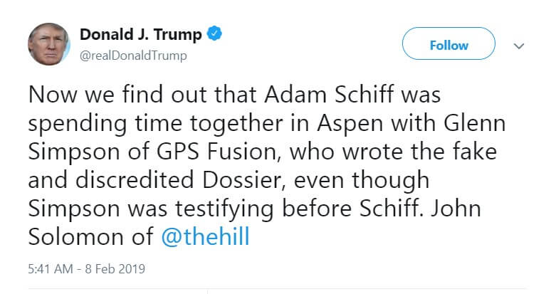 Недавно в Комитете Палаты представителей Конгресса США по вопросам разведки, которую после выборов возглавили демократы, заявили о возобновлении расследования российского вмешательства. Президент Трамп резко осудил это решение. Президент также обратил внимание на то, что лидер Комитета Палаты представителей демократ Шифф встречался с представителями компании, которая собирала компромат на Трампа в интересах Демократической партии накануне выборов 2016 года.