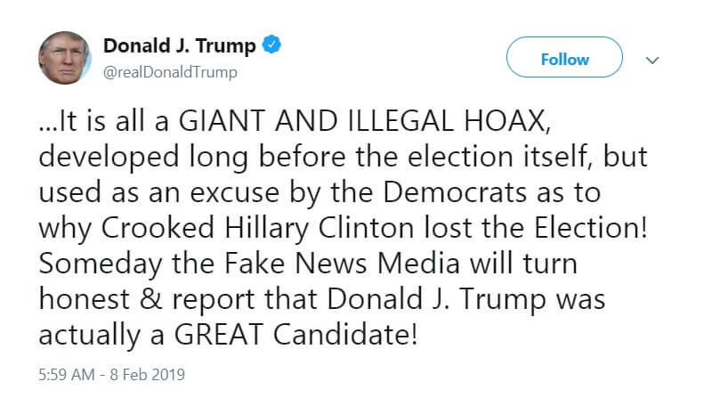 «…Все это огромная и противозаконная фальшивка, созданная еще до выборов, но в итоге использованная Демократической партией США, чтобы объяснить, почему лживая Хиллари Клинтон проиграла выборы! Когда-нибудь лживые СМИ станут честными и расскажут, что Дональд Трамп был прекрасным кандидатом», — заявил президент США в пятницу в своем Твиттере.