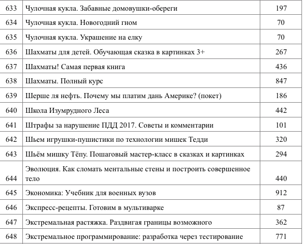 В договоре также встречаются учебники и практические пособия на разнообразные темы — от билетов для экзаменов в ГИБДД до книг о кишечнике, антибиотиках и старении. Экспедиция в том числе закупила учебники для вузов по информатике, пособия по английскому, китайскому и испанскому языку, по пошаговому рисованию животных, насекомых и техники, пособия для изготовления поделок, издание о Linux и «Копирайтинг: как не съесть собаку. Создаем тексты, которые продают».