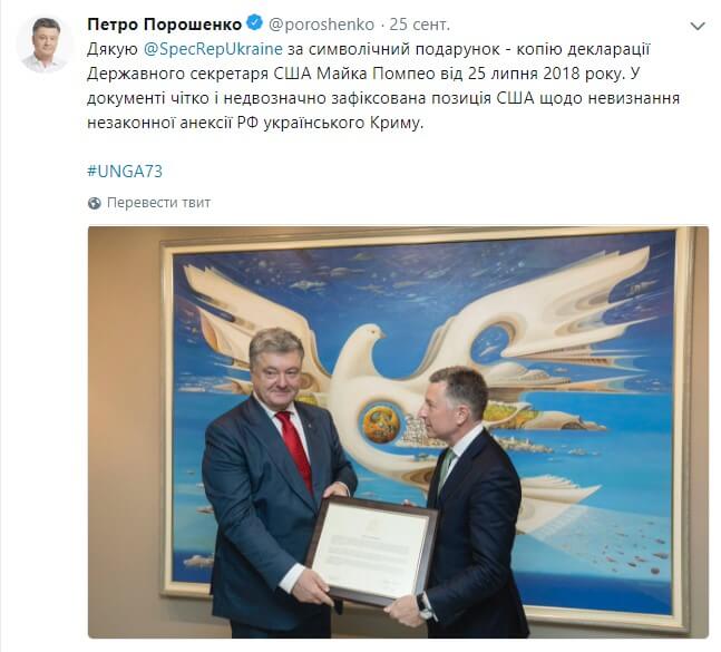 «Для меня большая честь вручить президенту Порошенко экземпляр «Крымской декларации», подписанный госсекретарем Майком Помпео», – написал Волкер в Твиттере, цитирует Крым.Реалии.