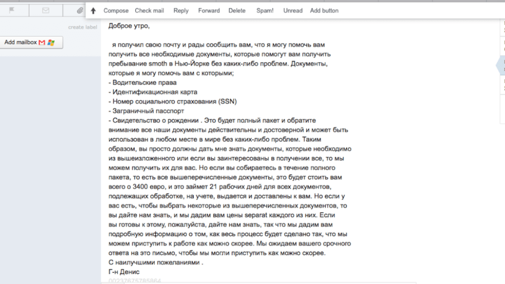 ForumDaily связался с несколькими компаниями, которые в интернете предлагают фальшивые документы. Аферисты откликнулись мгновенно. С одного из сайтов ответ пришел на русском, хотя текст больше напоминал гугл-перевод. Отвечавший представился Денисом. За комплект фальшивых документов (номер социального страхования, американский паспорт, свидетельство о рождении, ID, водительские права) попросил 3400 евро. Как оказалось, подпольный бизнес они ведут в Испании, поэтому и цена — в евро. Перечислять деньги просит на счет, открытый также в Европе.