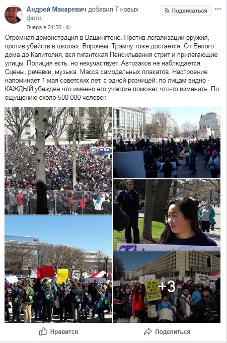«Огромная демонстрация в Вашингтоне. Против легализации оружия, против убийств в школах. Впрочем, Трампу тоже достается. От Белого дома до Капитолия, вся гигантская Пенсильвания-стрит и прилегающие улицы. Полиция есть, но не участвует. Автозаков не наблюдается. Сцены, речевки, музыка. Масса самодельных плакатов. Настроение напоминает 1 мая советских лет, с одной разницей: по лицам видно — КАЖДЫЙ убежден, что именно его участие поможет что-то изменить. По ощущению около 500 000 человек.»