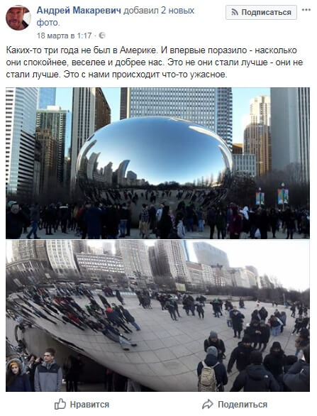 «Каких-то три года не был в Америке. И впервые поразило — насколько они спокойнее, веселее и добрее нас. Это не они стали лучше — они не стали лучше. Это с нами происходит что-то ужасное», — написал певец на своей странице.