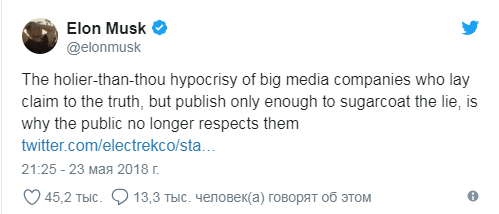На этом Маск не остановился и продолжил нападки на современную журналистику в следующих записях. Он объяснил негатив вокруг Tesla тем, что его компания не покупает рекламу в СМИ, в отличие от конкурентов.