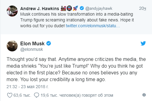 После этого репортёр The Verge Эндрю Хоукинс (Andrew Hawkins) ретвитнул запись Маска, написав, что он «продолжает медленную трансформацию» в человека, похожего на Трампа — накидывающегося на медиа и «кричащего» о фейковых новостях. Вскоре предприниматель ответил ему, заявив, что Трампа избрали как раз потому что медиа уже не имеют влияния.