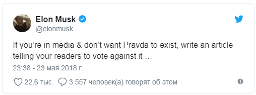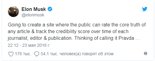 В результате Маск задумался о создании сайта с рейтингом правдивости новостей. По какой-то причине он захотел назвать ресурс русским словом «правда».