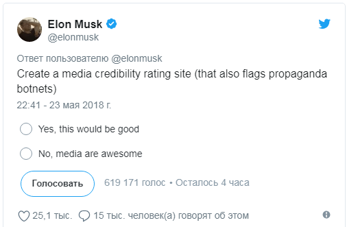 Журналистам, которым идея сайта не нравится, Маск предложил написать материал с критикой задумки и предложить читателям проголосовать против этого.