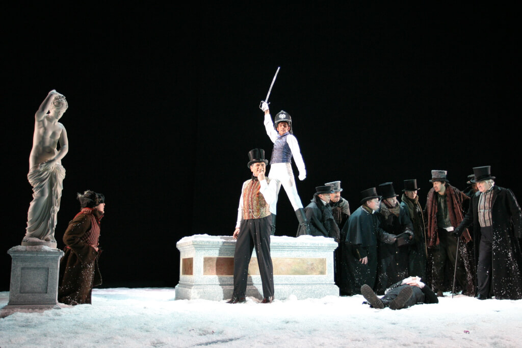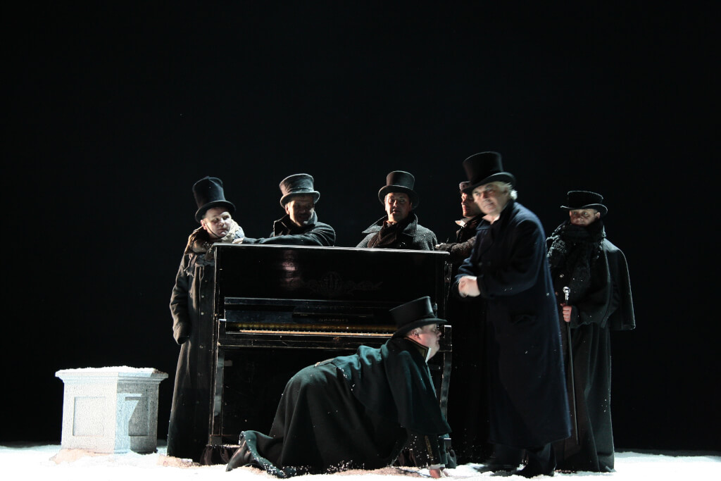 Головокружительный (в буквальном смысле) «Маскарад» Римас Туминас охапкой бросил на вахтанговскую сцену, спектакль стремительный, снежный и жадный — если под жадностью понимать обжигающую жажду страсти. У зрителей закружится голова, когда занавес из клубящегося снега создаст иллюзию полета — и мертвая холодная Нина (Мария Волкова), обратившаяся в собственное надгробие, будет словно парить в воздухе, и снег будет покрывать ее волосы, лицо, руки. И не таять. Уже не таять.