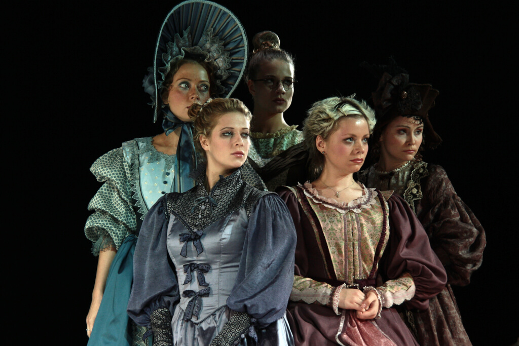 Наш спектакль о масках, которые носят люди, чтобы скрыть свою истинную сущность. Было бы достаточно просто изобразить петербургский бал «достоверным». Пожалуйста! Море иконографии! Позвать хореографа, изучить гравюры, заказать колонны и жирандоли…