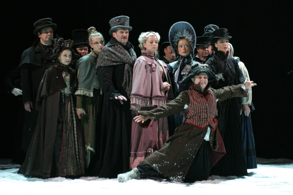 «Маскарад» — это новая московская редакция спектакля, поставленного Туминасом в 1997 году в Вильнюсском малом драматическом, одна из визитных карточек режиссера. Те, кто видел вильнюсский вариант, — неизбежно сравнивают, ищут разницу. Те, кто не видел, поражаются безупречности сценического вкуса, который выражается во всем — в кружащейся метели, в безумии хачатуряновского вальса, в бессловесных интермедиях, наполненных режиссерскими фантазиями, в которых столько мальчишеского азарта и юмора.