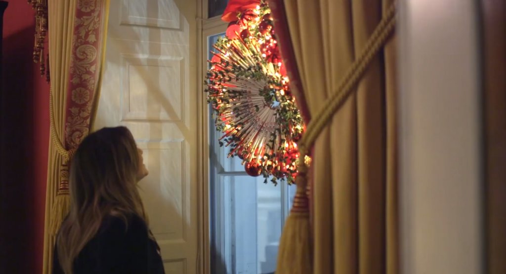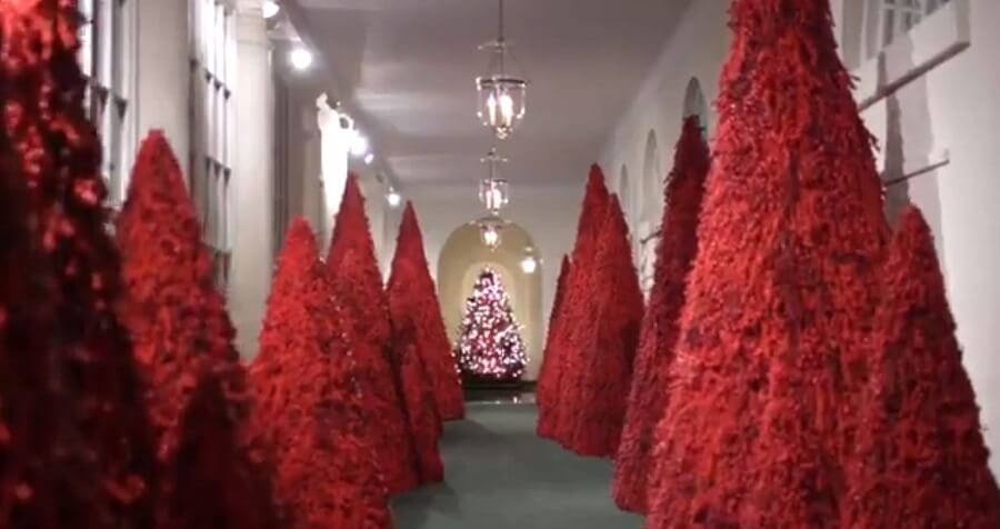 На кадрах видно, как супруга американского президента проходит по декорированным коридорам и комнатам резиденции. В помещениях установлено множество елей, оформленных в разных цветовых гаммах. В восточной колоннаде президентской резиденции поставили около 40 кроваво-красных елей.