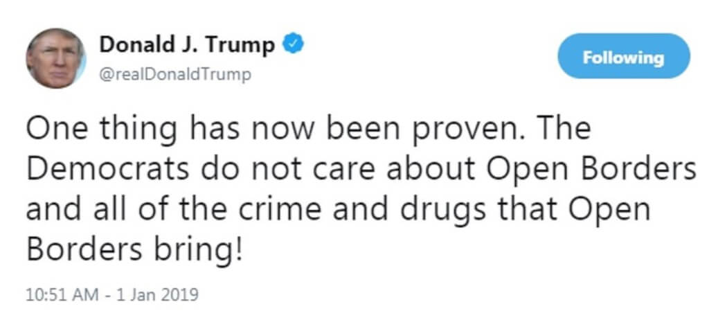 «Теперь доказана одна вещь. Демократы не заботятся об открытых границах и обо всех преступлениях и наркотиках, которые несут эти открытые границы», — написал Трамп в Твиттере утром 1 января.