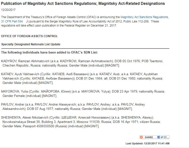 Помимо Кадырова в санкционном списке значатся четверо россиян: Аюб Катаев, Юлия Майорова, Андрей Павлов и Алексей Шешеня. Данная информация размещена на сайте Министерства финансов США.