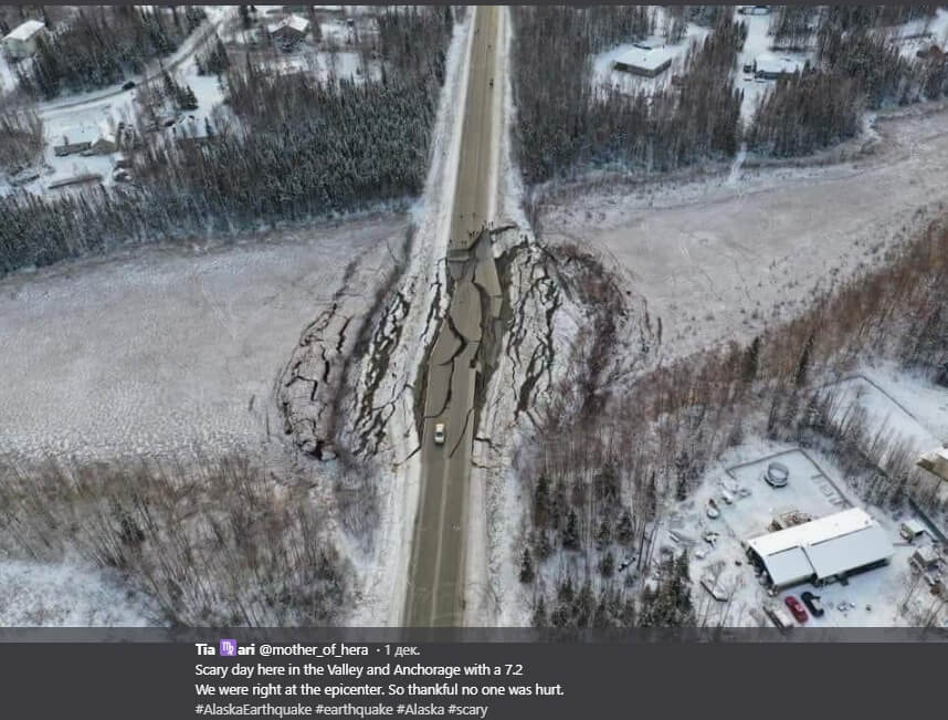 Напомним, что 30 ноября на Аляску обрушилось мощное землетрясение силой 7,0 баллов, что привело к разрушению дорог и трещинам на зданиях в Анкоридже. Посмотреть фото и видео этого события можно здесь.