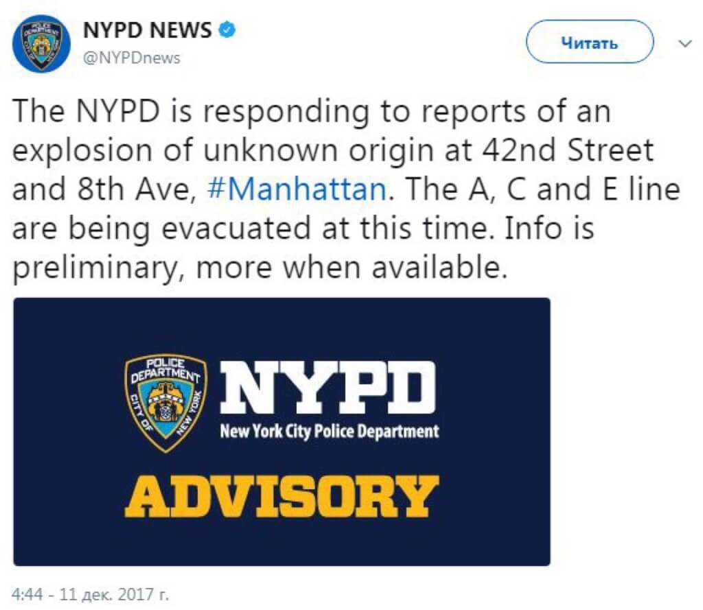 «Полиция Нью-Йорка реагирует на сообщения о взрыве неизвестного происхождения на 42-й улице и 8-м пр.», — сообщается в Twitter отделения полиции.