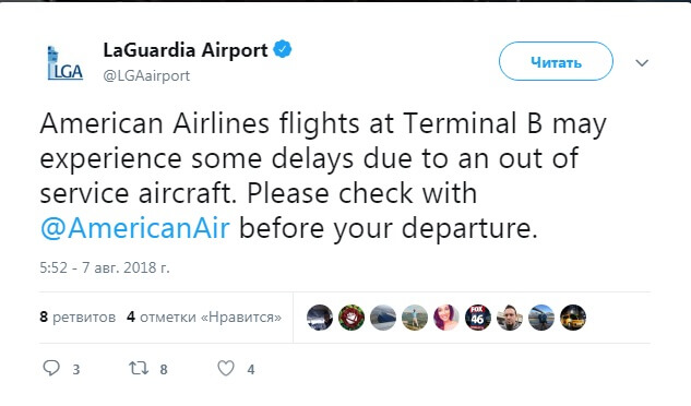 «Полеты American Airlines в Терминале B могут задерживаться из-за самолета. Пожалуйста, свяжитесь с @AmericanAir перед выездом», — говорится в сообщении.