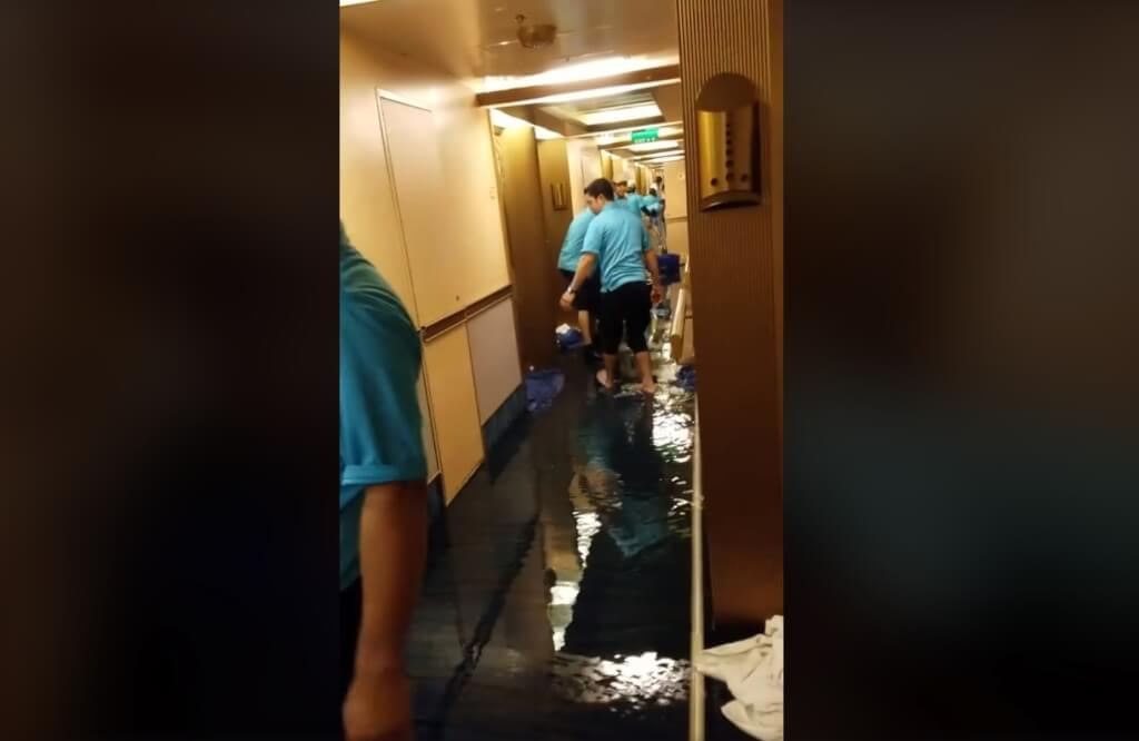 Видео, которое успел снять пассажир Carnival Dream, показывает членов экипажа, которые ведрами пытаются вычерпывать воду в коридоре.