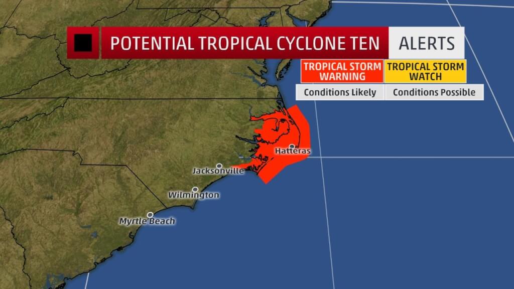 Штормовые предупреждения 29 августа были выпущены в отношении восточной части Северной Каролины, на север от Серф-Сити до Дака, сообщает Weather.com.