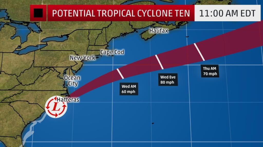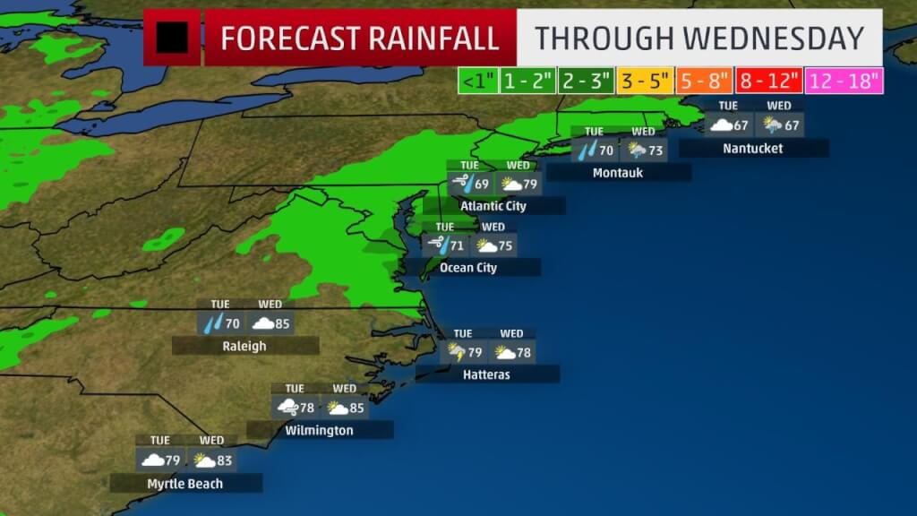 Во вторник на этих территориях ожидается сильный ветер (от 63 км в час). После обрушения на Северную Каролину шторм начнет набирать силу и двигаться через северо-восточные штаты США. Шторм принесет с собой дождевые осадки от 3 до 13 см вдоль восточного побережья США от Северной Каролины до Вирджинии. В этих районах возможны локализованные наводнения, и штормовые волны.