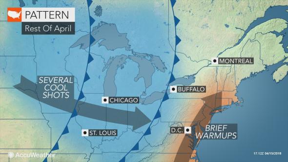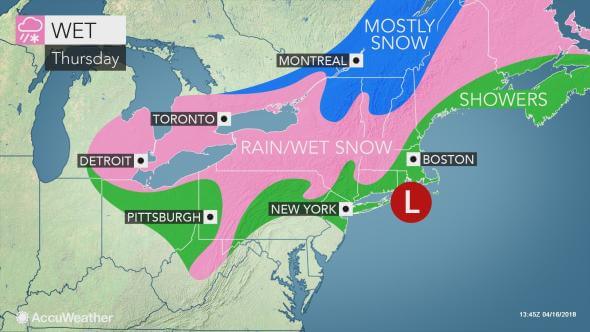 Между этими штормами в среду ожидается повышение температуры, которая будет в пределах нормы для середины апреля, варьируясь от 4 до 21 градуса по Цельсию в зависимости от региона. Самой холодной будет погода в Новой Англии, теплее всего будет в юго-восточной Вирджинии.