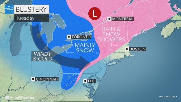 С вечера 17 апреля холодный воздух и непогода начнут распространяться от Аппалачей на восток — к Атлантическому океану. В некоторых районах снегопады будут достаточно сильными, чтобы создать на земле снежный покров, поэтому водителям советуют быть осторожными из-за скользких дорог.