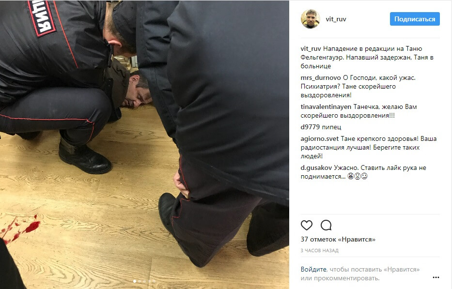 Радиостанция «Эхо Москвы» сообщила днем в понедельник, 23 октября, о том, что ворвавшийся в редакцию мужчина «ударил ножом в горло ведущую радиостанции Татьяну Фельгенгауэр». Ведущую госпитализировали сразу после нападения и провели операцию. В момент публикации этого материала, Татьяну Фельгенгауэр ввели в искусственную кому.