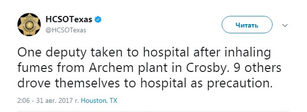 Завод Arkema находится в 34 километрах от Хьюстона в городе Кросби, он прекратил работу в пятницу, еще до начала урагана.