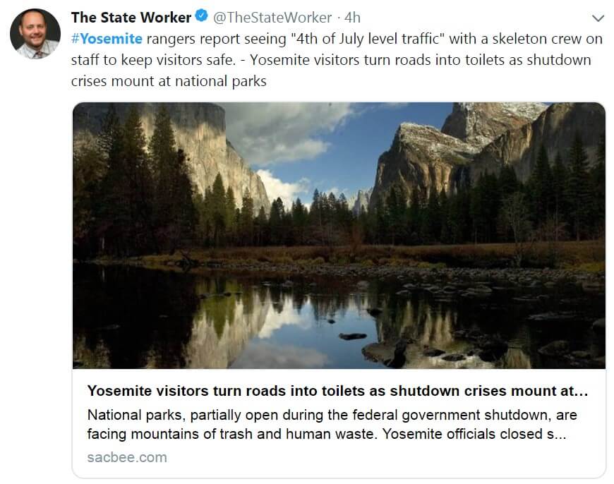 С 22 декабря в калифорнийском парке были закрыты санузлы и центры для посетителей, а также приостановлен сбор мусора. Тем не менее, сам парк оставался открытым, пишет Fox News. К понедельнику фекалии и мусор начали буквально поглощать Йосемити и другие национальные парки страны.
