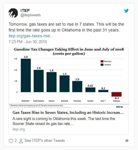 Оклахома оказался одним из семи штатов среди Южной Каролины, Индианы, Мэриленда, Теннесси, Вермонта и Айовы, которые повысили налог на бензин, для финансирования строительства или ремонта дорог и мостов. А штат Небраска наоборот, понизил свой налог на бензин.