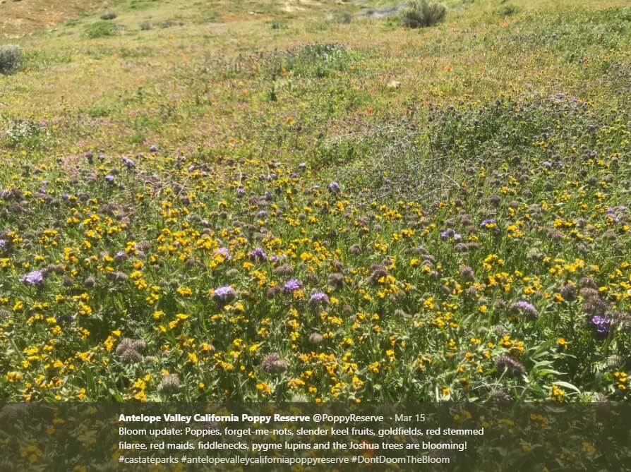 Пик цветения полевых цветов сейчас можно наблюдать у Национального монумента равнины Карризо в восточной части округа Сан-Луис-Обиспо. И это не только маки, но и нежные маргаритки, фацелии, ромашки привносят в картину оттенки фиолетового и желтого.