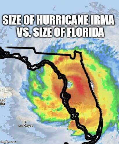 Посмотрите на приведенную ниже иллюстрацию, в которой сравнивается размер Флориды с размером урагана Irma (спутниковый снимок Weather Underground).