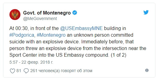 В посольстве США в Черногории прогремел взрыв, сообщили власти страны. Неизвестный злоумышленник бросил, как предполагается, ручную гранату в здание посольства в столице Черногории Подгорице, после чего покончил с собой, пишет ВВС.