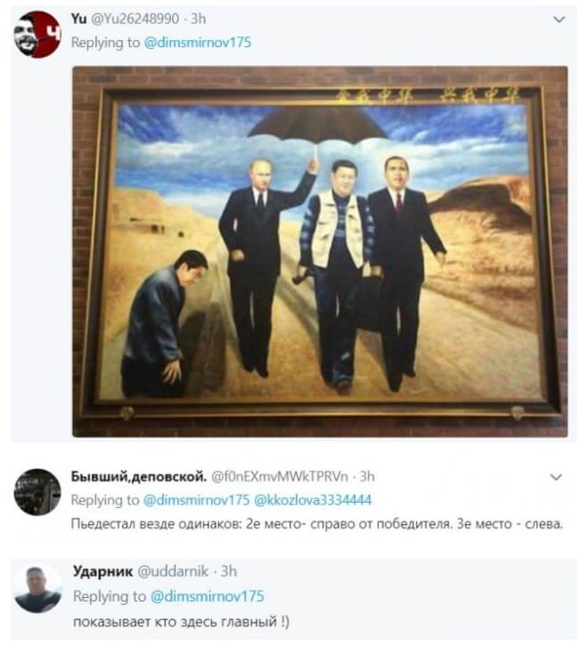 Пользователи немедленно отреагировали на эту ситуацию саркастичными комментариями и «фотожабами» – так, в комментариях показали «картину», на которой Путин держит зонт над идущими предыдущим президентом США Бараком Обамой и председателем КНР Си Цзиньпином.