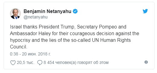 «Вместо того чтобы заниматься режимами, которые систематически нарушают права человека, Совет ООН навязчиво фокусируется на Израиле, единственной подлинной демократии на Ближнем Востоке», — отреагировал на это Нетаньяху на своей странице в Twitter. «Израиль благодарит президента Трампа, госсекретаря Помпео и представителя США [при ООН] Хейли за их мужественное решение действовать против лицемерия и лжи так называемого Совета ООН по правам человека», — добавил премьер-министр.