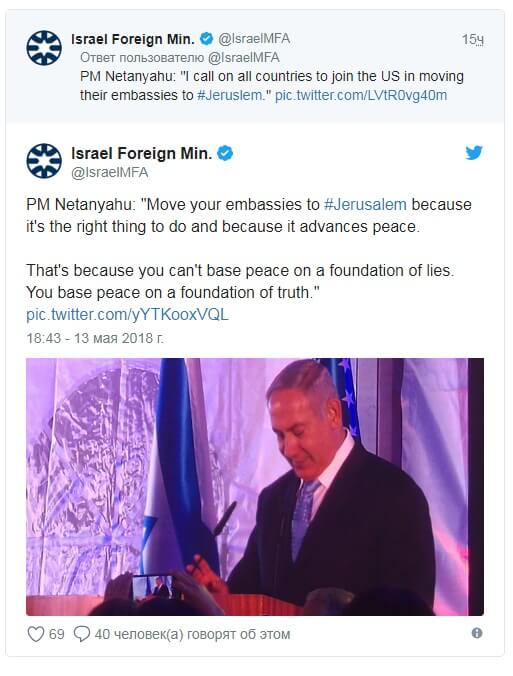 Как пишет РБК, об этом он заявил во время выступления на торжественном приеме в честь предстоящего открытия американского посольства в Иерусалиме. Слова Нетаньяху приводит пресс-служба МИД Израиля на своей странице в Twitter.