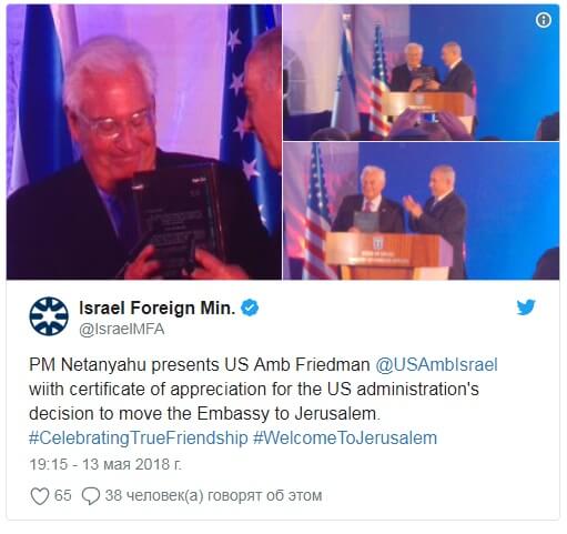 Нетаньяху передал послу США в Израиле Дэвиду Фридману сертификат благодарности в связи с переносом посольства.