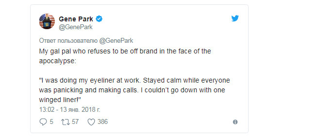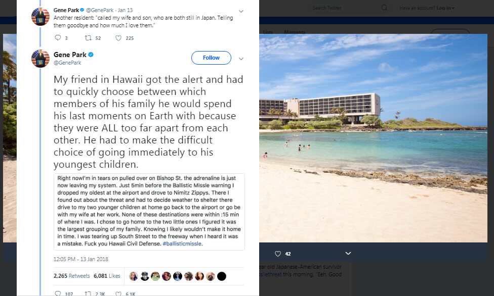 «Прямо сейчас я в слезах стою на Бишоп-стрит. За пять минут до оповещения я отправил старшего сына в аэропорт и пошёл в ресторан Nimitz Zippys, где и узнал об угрозе. И я задумался о том, куда мне отправиться: к двум моим младшим детям домой, обратно в аэропорт или на работу к жене. Я был в 15 минутах от каждого из пунктов. Я решил отправиться к детям — таким образом собралась бы большая часть семьи. При этом я осознавал, что могу не успеть доехать до дома. Когда я мчался домой, то узнал, что это был ложный сигнал. К чёрту вас, министерство обороны Гавайев».