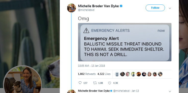 Кто-то плакал, кто-то прощался с детьми, а кто-то — спокойно собирал вещи и еду в убежище: 13 января в 08:07 утра по местному времени жители Гавайев получили сообщения о запуске баллистической ракеты по островам и увидели их по ТВ. Людей просили искать убежище и подчёркивали, что «это не учения». Только через 38 минут власти США подтвердили, что тревога была ложной.