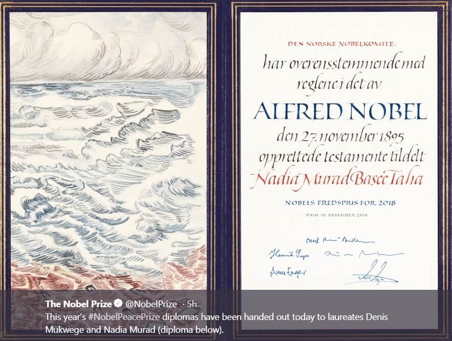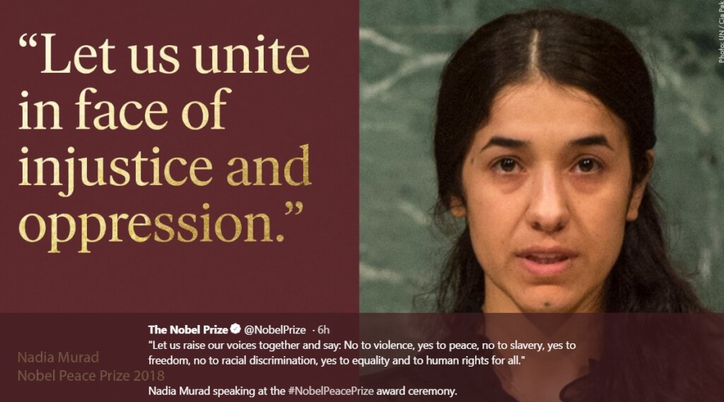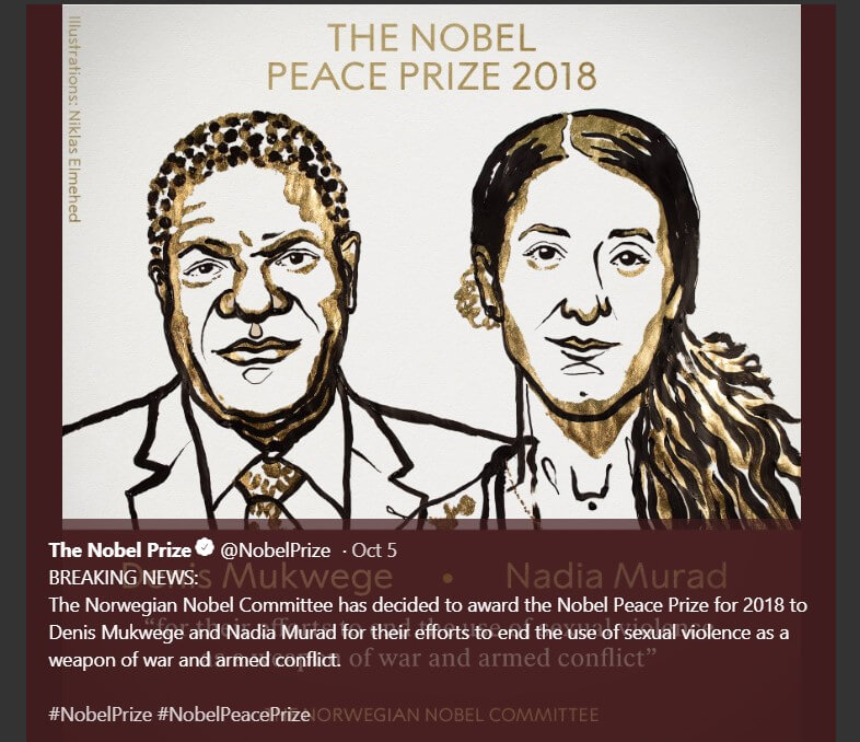 Как отмечает комитет, «Муквеге посвятил большую часть своей жизни помощи жертвам полового насилия в Конго», » он и его команда занимались лечением тысяч жертв, пострадавших от насилия». Там указали, что в свою очередь «Надя Мурад является свидетелем, которая рассказала о насилии в отношении нее и остальных жертв», «проявила необыкновенное мужество, поведав о своих страданиях и выступив от имени других». В комитете добавили, что Надя — одна из 3 тысяч езидских девушек, которые подвергались систематическому насилию террористов из ИГ, которое являлось частью их военной стратегии».