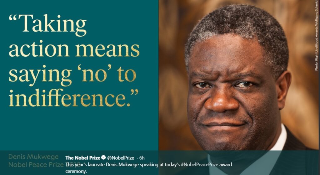 По ее словам, она благодарна за то, что ей присудили Нобелевскую премию мира, но «фактом остается то, что единственной наградой, которая может восстановить честь [подвергшихся насилию на войне женщин], является правосудие и уголовное преследование преступников».