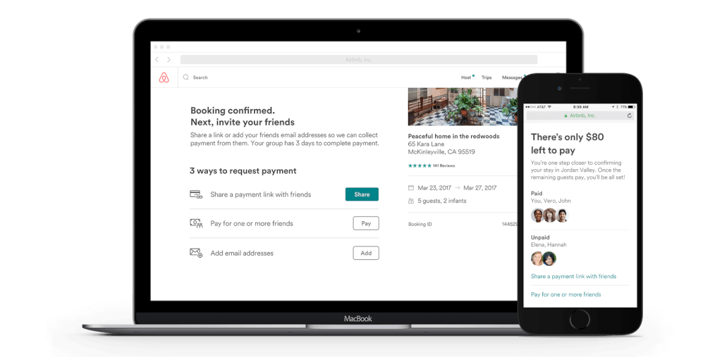 Теперь после подтверждения бронирования вам будет предложено поделиться ссылкой на оплату, заплатить за одного или более друзей или ввести адреса электронной почты, если ваши друзья еще не зарегистрированы на Airbnb. Последнее — тоже хитрый ход от компании. Проведенный анализ показал, что 30% бронирований с разбивкой платежа приводят минимум к одному новому пользователю для платформы. Хитрый ход дополнительного набора пользователей.
