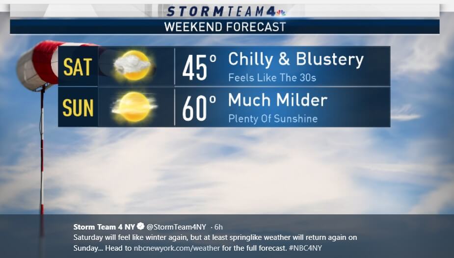 В выходные синоптики обещают сухую погоду. Суббота, 23 марта, будет холодной — температура воздуха временно опустится до 40 по Фаренгейту (4 по Цельсию) в сочетании с частичной облачностью. Но к воскресенью столбик термометра вновь поползет вверх и, не исключено, доберется до отметки в 60 градусов по Фаренгейту (15 по Цельсию).