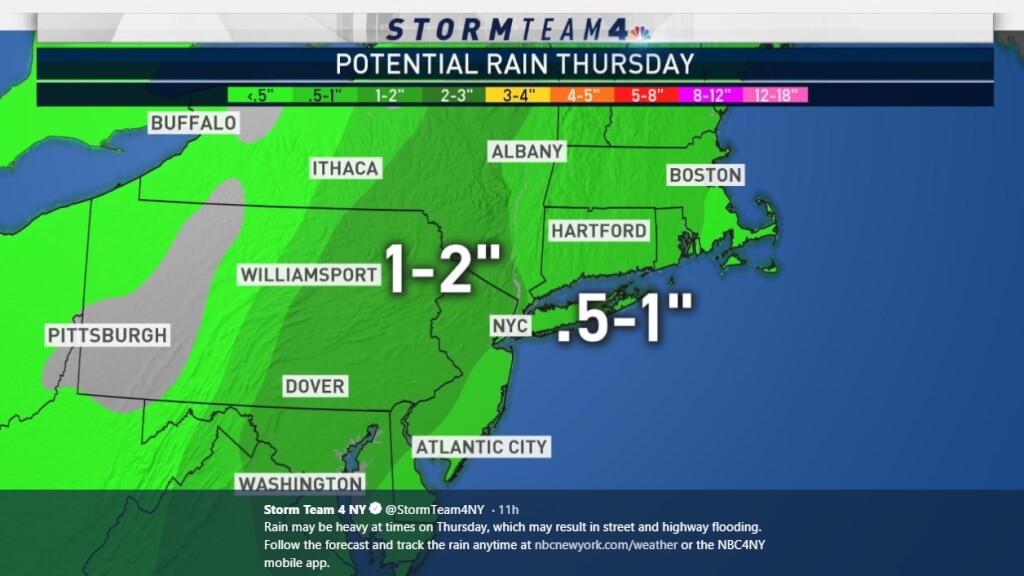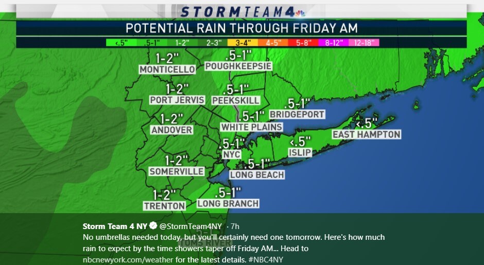 Самые сильные дожди придутся на северную и западную части города Нью-Йорк, там выпадет около 1-2 дюймов осадков (2,5-5 см), пишет NBC New York.