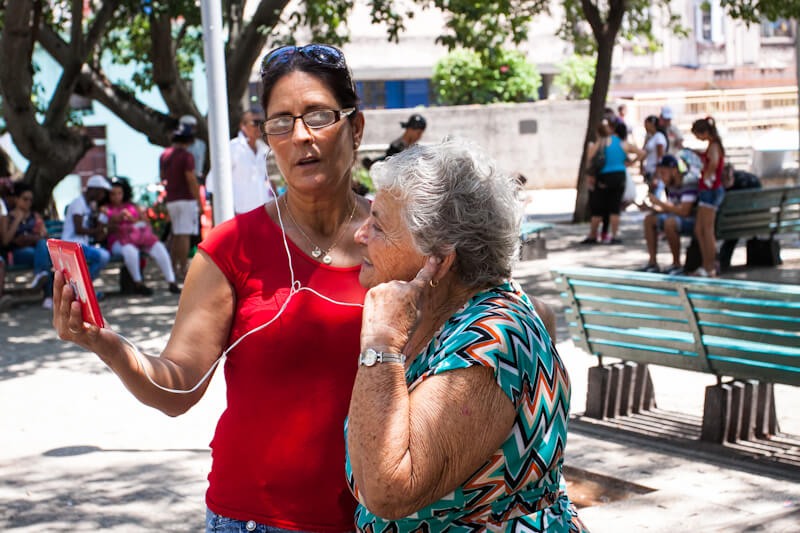 Интернет появился на Кубе совсем недавно, и теперь у местных есть карты с точками вай-фай доступа. Удовольствие медленное и недешевое: карточка пополнения – около одного доллара за полчаса. Деньги, по местным меркам, немалые. Ждать соединения приходится иногда около 20-30 минут, карточек не хватает, их раскупают перекупщики – мальчишки 15-16 лет, снующие между болтающими с “заграницей” взрослыми. Старушки и молодежь, молодые мамы и папаши с детьми устраивают сеансы видеосвязи с родней, уехавшей с Кубы много лет назад. Большинство осело в Майами, в каких-то 400 километрах от Гаваны. Теперь они американские граждане, и с декабря США официально разрешили им навещать родню на Кубе.