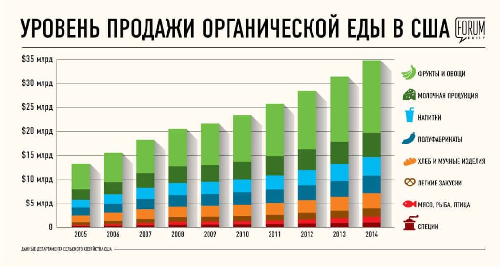 Статистика Департамента сельского хозяйства США свидетельствует: люди с каждым годом покупают все больше и больше органических продуктов. Если в 1990 году объем продаж органической еды в США составлял около одного миллиарда долларов, в 2005 — около 13 миллиардов, то в 2014 — почти 35 миллиардов долларов.