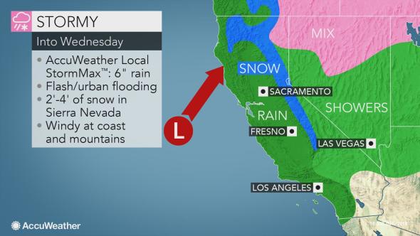 Ожидается 6 дюймов (15 см) вдоль южных и юго-западных гор. Аналогичные объемы осадков можно ожидать в Северной Калифорнии.