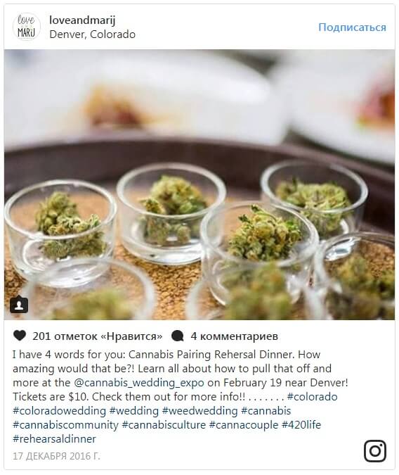 Такие свадьбы становятся популярными в тех штатах, где узаконили употребление марихуаны: Калифорнии, Нью-Джерси, Аляске, Колорадо, Мэн, Массачусетсе, Неваде, Орегоне и Вашингтоне.