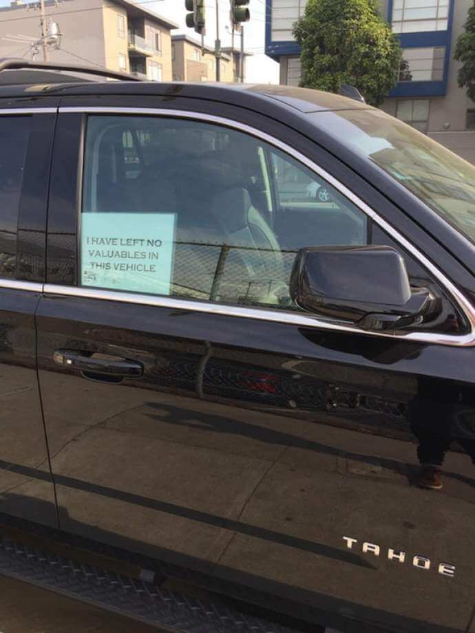 В Сан-Франциско, где ни один из припаркованных на улице автомобилей не застрахован от угона или кражи находящихся внутри вещей, встречаются автовладельцы, которые оставляют потенциальным ворам записку, что внутри нет каких-либо ценностей. Таким образом автовладельци надеются, что вор прочитает ее и решит взломать другую машину.