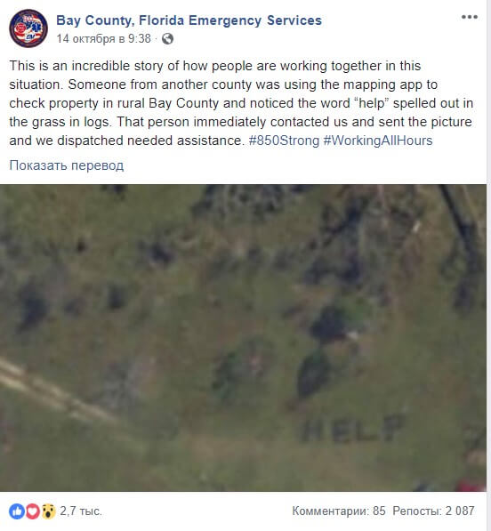 Пара из Флориды использовала упавшие деревья, чтобы выложить слово HELP на земле возле своего дома после урагана Майкл. Мужчину и женщину успешно спасли — племянница увидела их призыв на интерактивной карте аэросъемки.